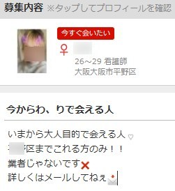 - 「セフレ募集中」「即会いOK」など、あからさまな文言